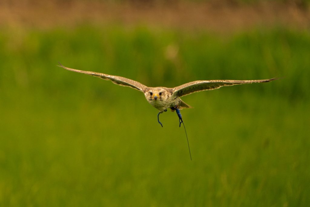 Wüstenbussard Quinn während der Beizjagd.